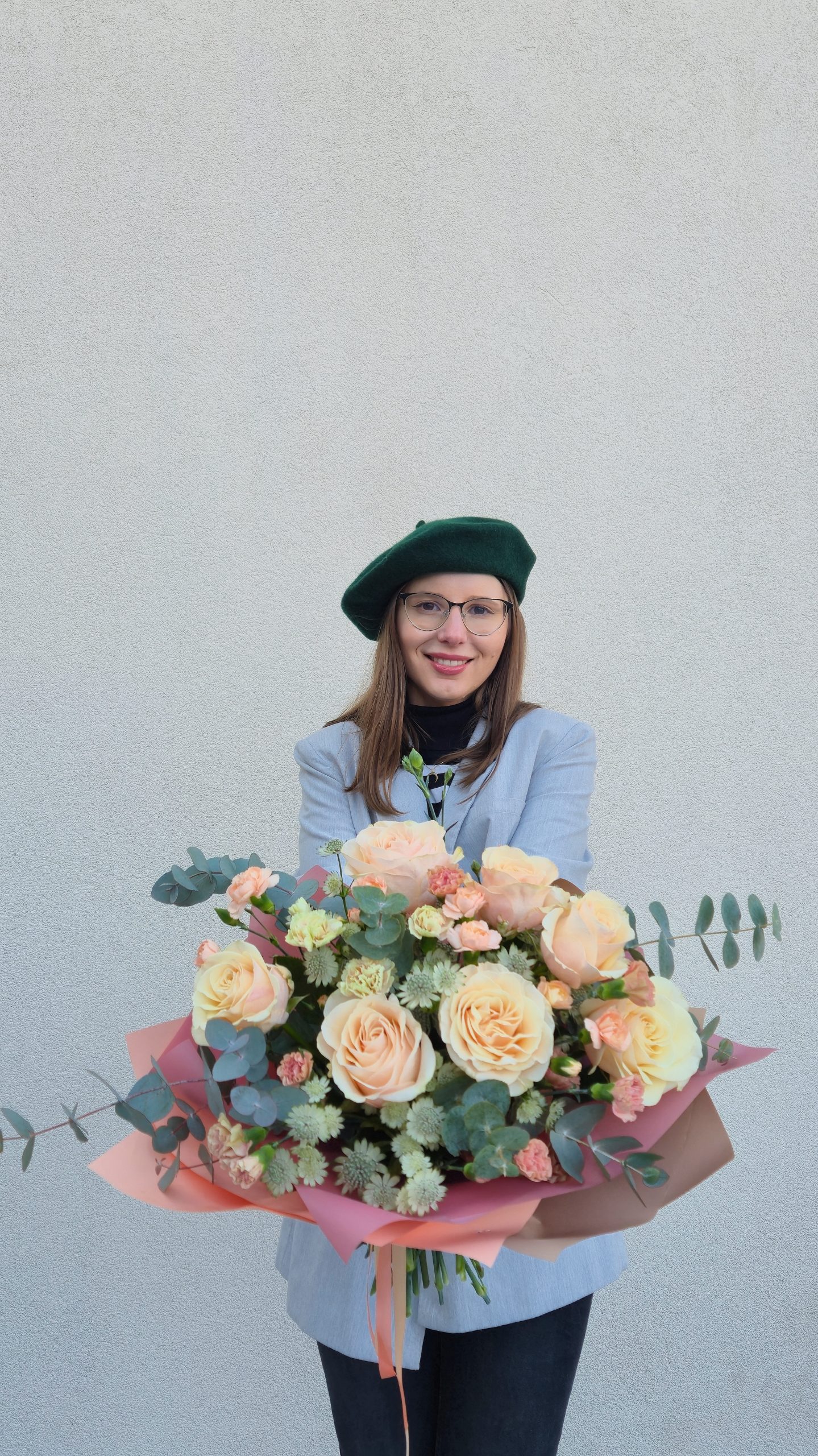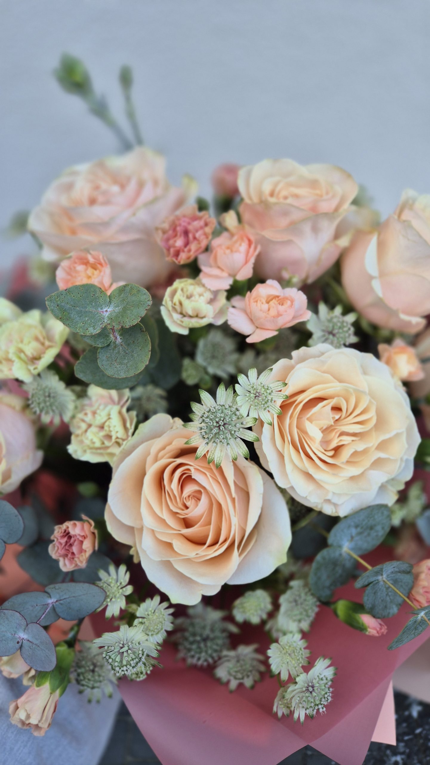 Bukiet ‘Brzoskwiniowy poranek’ to harmonijne połączenie klasyki i delikatności. Centralne miejsce zajmują tu pełne, brzoskwiniowe róże, symbolizujące wdzięczność, podziw i subtelny urok. Uzupełniają je urocze pastelowe goździki w odcieniach brzoskwini i jasnej zieleni wnoszą nutę elegancji i podziwu, tworząc spójną całość. Całość otulona jest eukaliptusem, który pięknie kontrastuje z pastelowymi barwami, symbolizując ochronę i świeżość, oraz intrygujące sezonowe dodatki, które zapewniają unikalną teksturę.