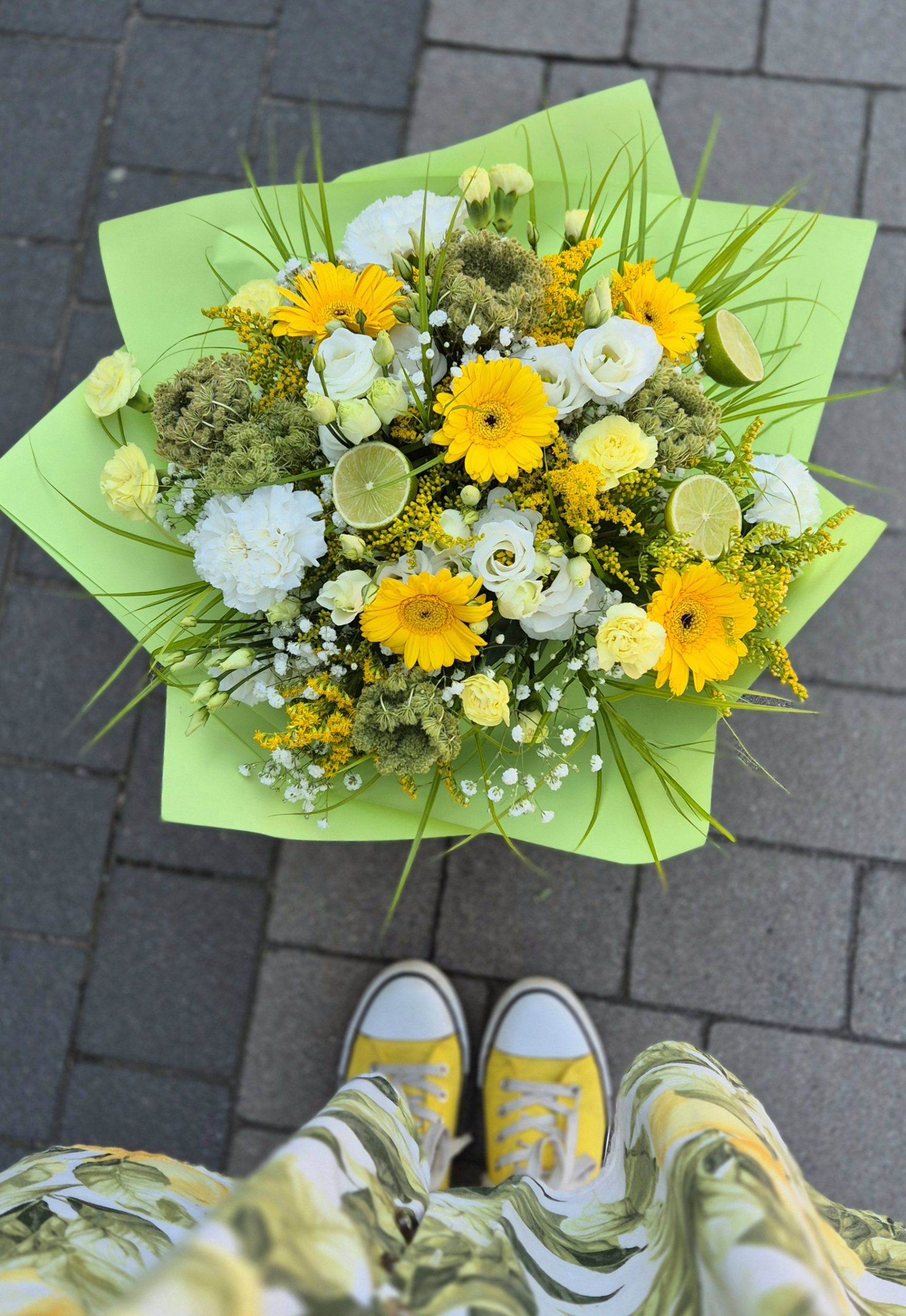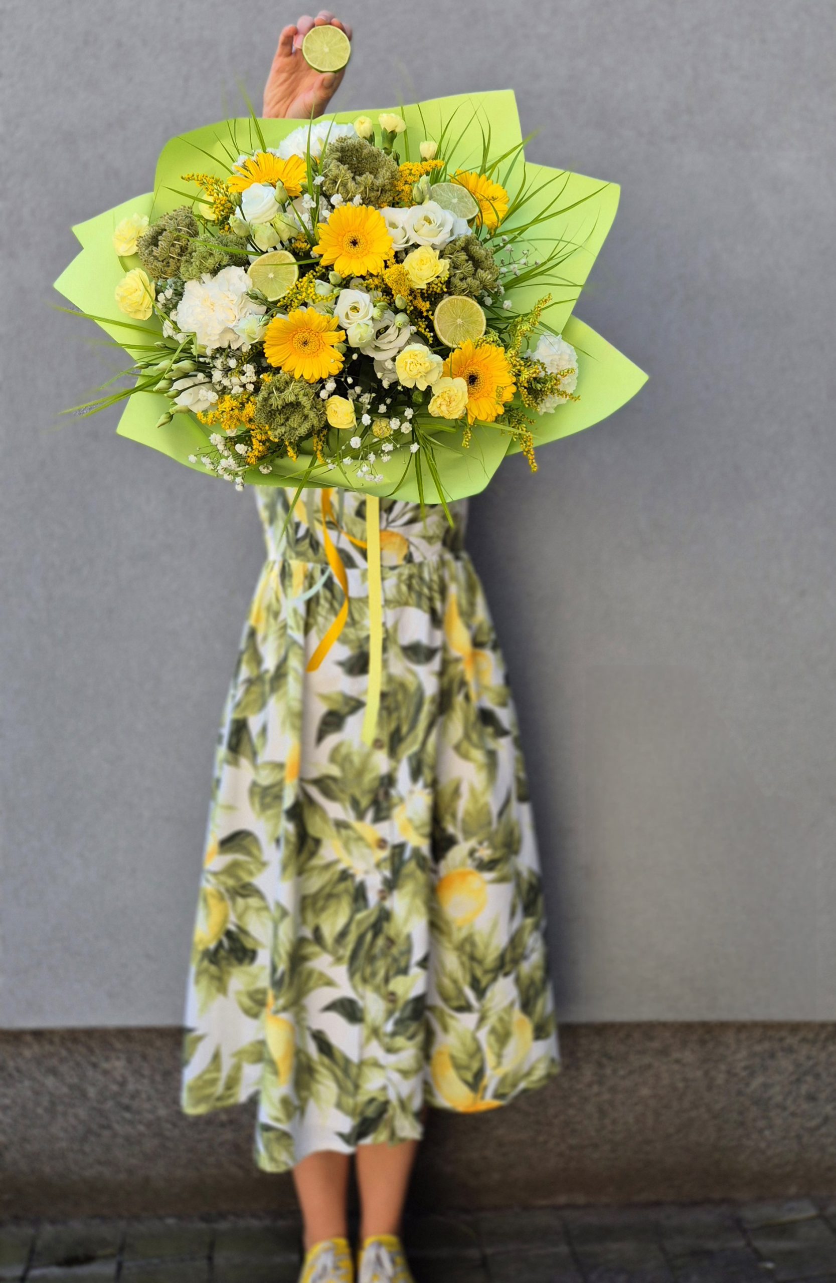 Co wyróżnia ten bukiet spośród innych, to jego unikalny schemat kolorystyczny – połączenie intensywnej żółci z orzeźwiającą, limonkową zielenią, podkreśloną przez świeże plastry cytrusów. Ten niezwykły dodatek nie tylko wzbogaca kompozycję wizualnie, ale także nadaje jej subtelny, świeży aromat, czyniąc ją prawdziwie zmysłowym doświadczeniem. Starannie dobrane kwiaty i odważne akcenty tworzą bukiet, który jest kwintesencją lata – pełen życia, radosny i absolutnie niezapomniany. To manifestacja kreatywności i natury w jej najpiękniejszym, słonecznym wydaniu.